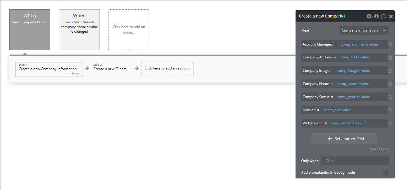 I am new to Bubble. I am planning to create a sales CRM. I have two tables at the moment: Table 1 is called “Company Information,” and Table 2 is called “Clients Information.”
