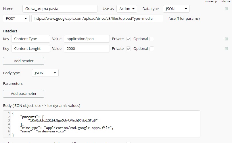 I’m trying to send a Json file to google drive, so that it is placed inside a specific folder, called “INPUT”. I can now send the file, but it only falls into the “my drives” folder. Does anyone know how to solve?