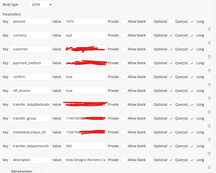 Wow thanks so much for the fast reply - this is super annoying. Its the “au_becs_debit” parameter which only appears when displaying the API call in a workflow. I have tried to do the old add back and delete - but to no success - it didn’t duplicate which was hopeful, but then just stayed once I deleted it again.