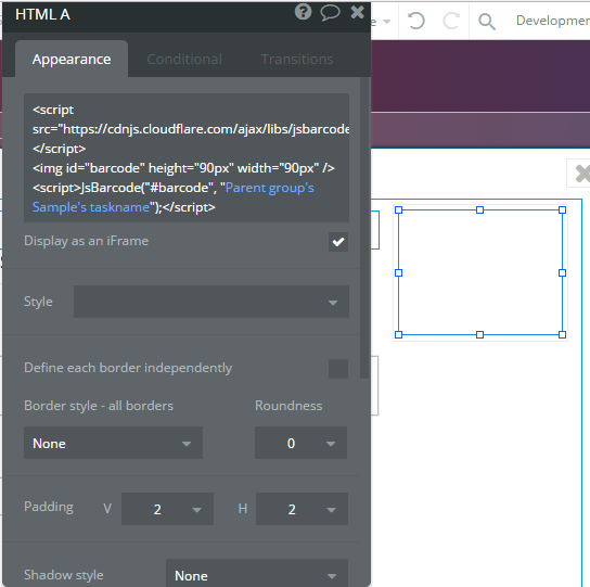 Quick example of rendering an on-screen barcode using, jsBarcode an iFrame (a small snippet of code):