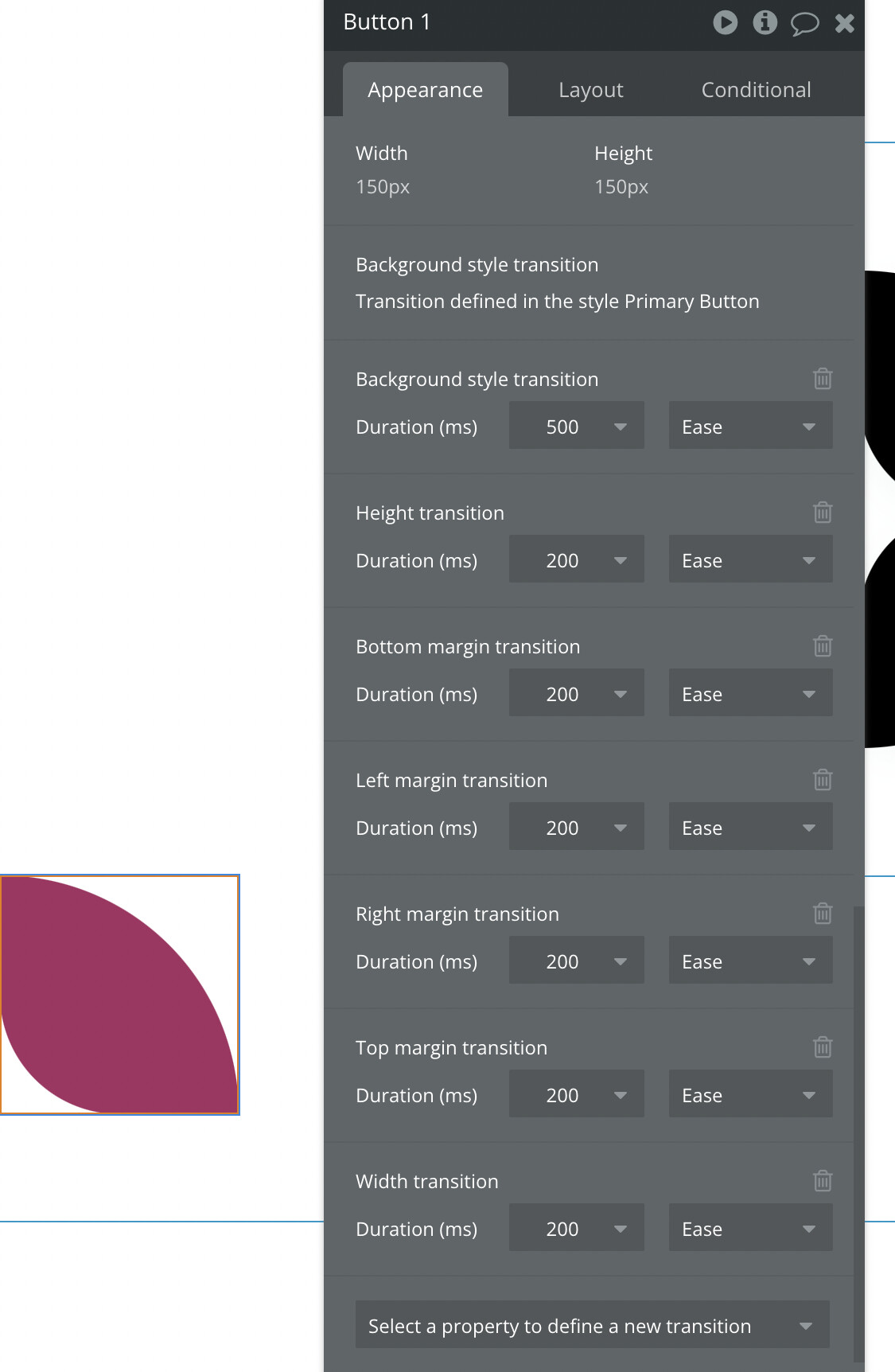 -You want the button to grow in size, so give it height and width transition. Make sure it’s height and width, not min height or min width.