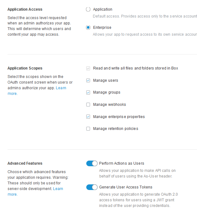 - Make your “application scopes” & “advanced features” (if you change any of these settings at a later date you must follow step 16 except choosing to reauthorize the app to makes the changes take effect).