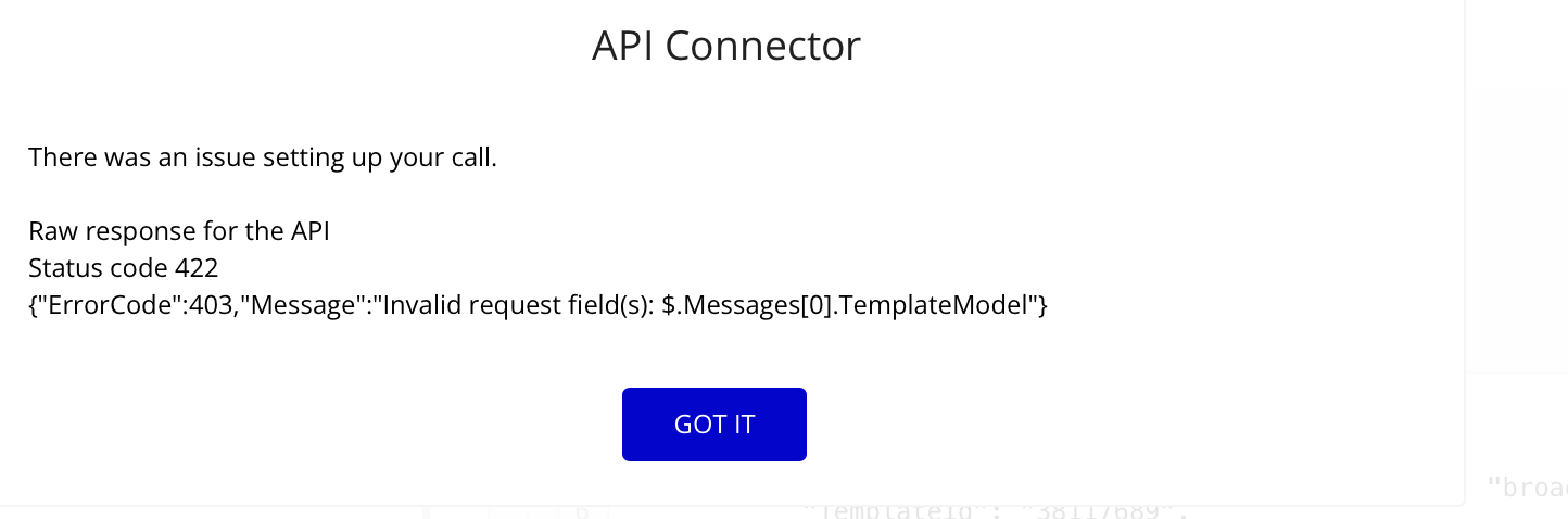 Thanks, but I’m having trouble getting the call to initialize in the API connector. I’m following the example here for the batch send (with template): Templates API | Postmark Developer Documentation ’