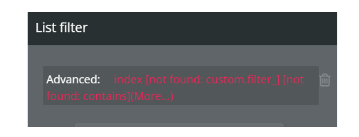 that ‘not found: custom.filter’ is the name of the custom state you had on your page index that the group you converted to a reusable element was using and that final ‘contains’ that has ‘more’ after it is likely referencing a custom state list on the page as well or a list on the page that is not in your reusable element now.