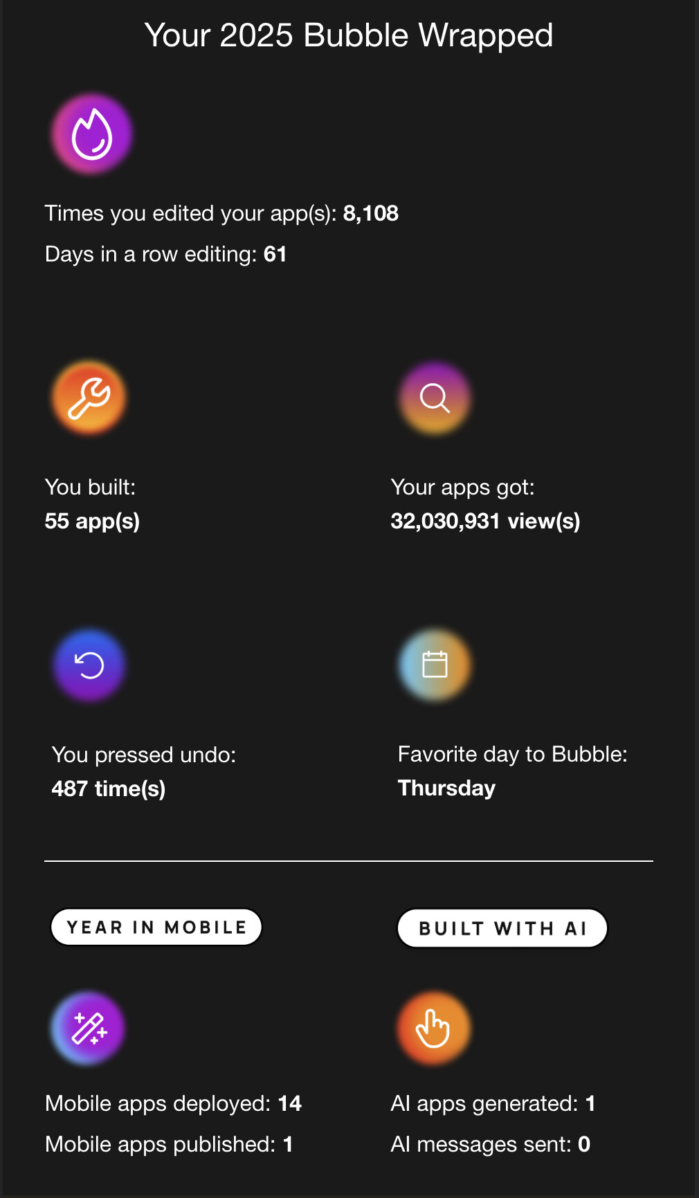 Beyond personal stats, BubbleWrapped shows what we built together as a community — apps launched worldwide, workflows run, and builders connecting across the globe.