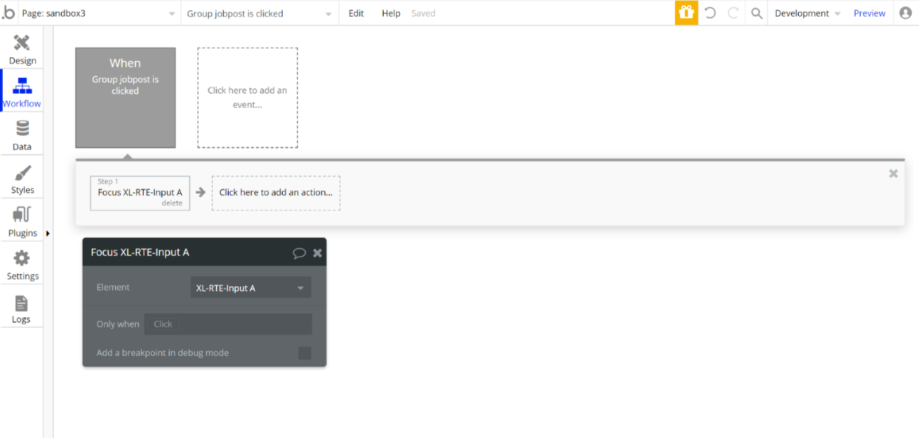 What I tried this time is when a row in repeating group is clicked, unique ID of that row get passed to custom state called “Group JobpostB’s unique ID” as text, and XL editor set up as below: