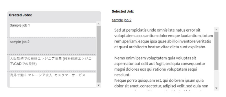 “sample job 1” was selected / clicked from Repeating Group on the left to pass custom state job post for display on the right constructed using XL-Rich Text Editor