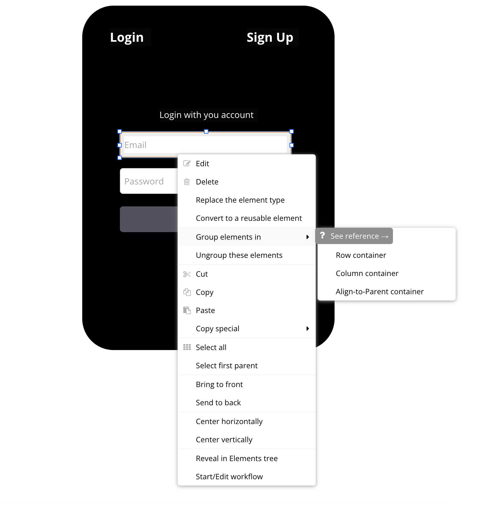 If you click one of those options like Row container it puts them all in a new group in a Row layout