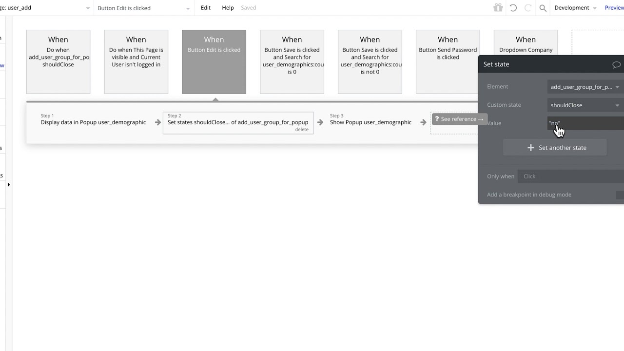 I went to my Reusable Element and when the save button was closed, I added a custom state called “shouldClose” and set it to type “YES/NO” and a default of “YES” every time the save button is clicked