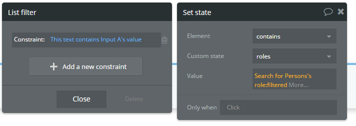 For multiple role searches, I’ve been using separate searches Do a search for RoleX megedwith Do a search for RoleY merged with , etc. It would be nice if Bubble opened up the recordID (ex. 1458364798130x448803103687777760) for table entries (you can see them in the App Data tab), so that we could reference a Roles Thing that has all possible roles in in it, and update as needed).