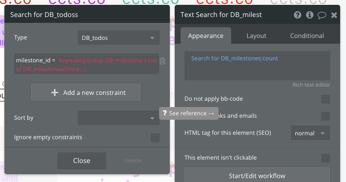 I am now trying to show a repeating groups which shows the number of milestones of a project (done!) and the number of total todos of a project (problem