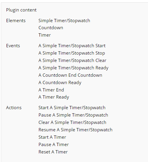 Please check the Demo Page and the Documentation for this plugin in order to find a description of the functionality: https://docs.zeroqode.com/plugins/simple-timer-countdown-and-stopwatch-plugin