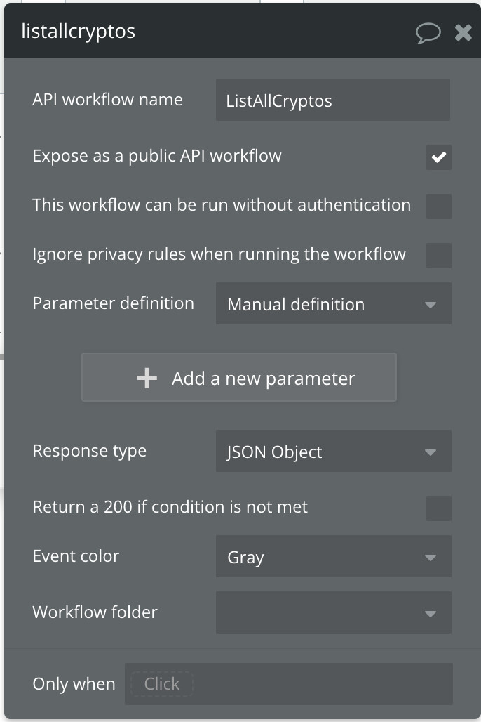 Create Backend Workflow to create new thing (your crypto). I only used name and price, please adapt: