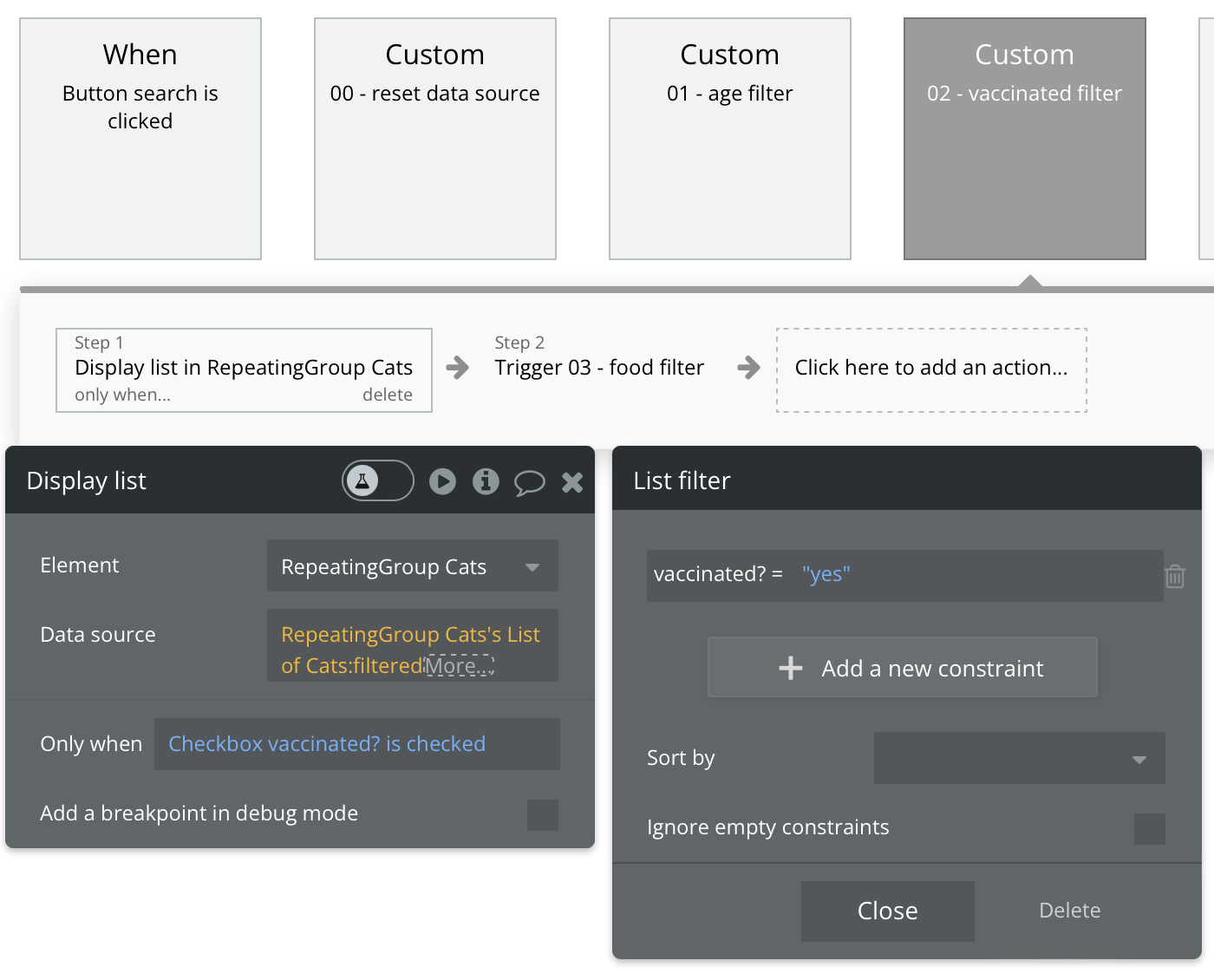 I had a quick question. If I am doing a search for a RG that starts off showing all results. If I then want to add filtering to this, is it best practice to add constraints to the Search with “ignore constraints” checked or to build out some sort of daisy chain filtering with custom events?