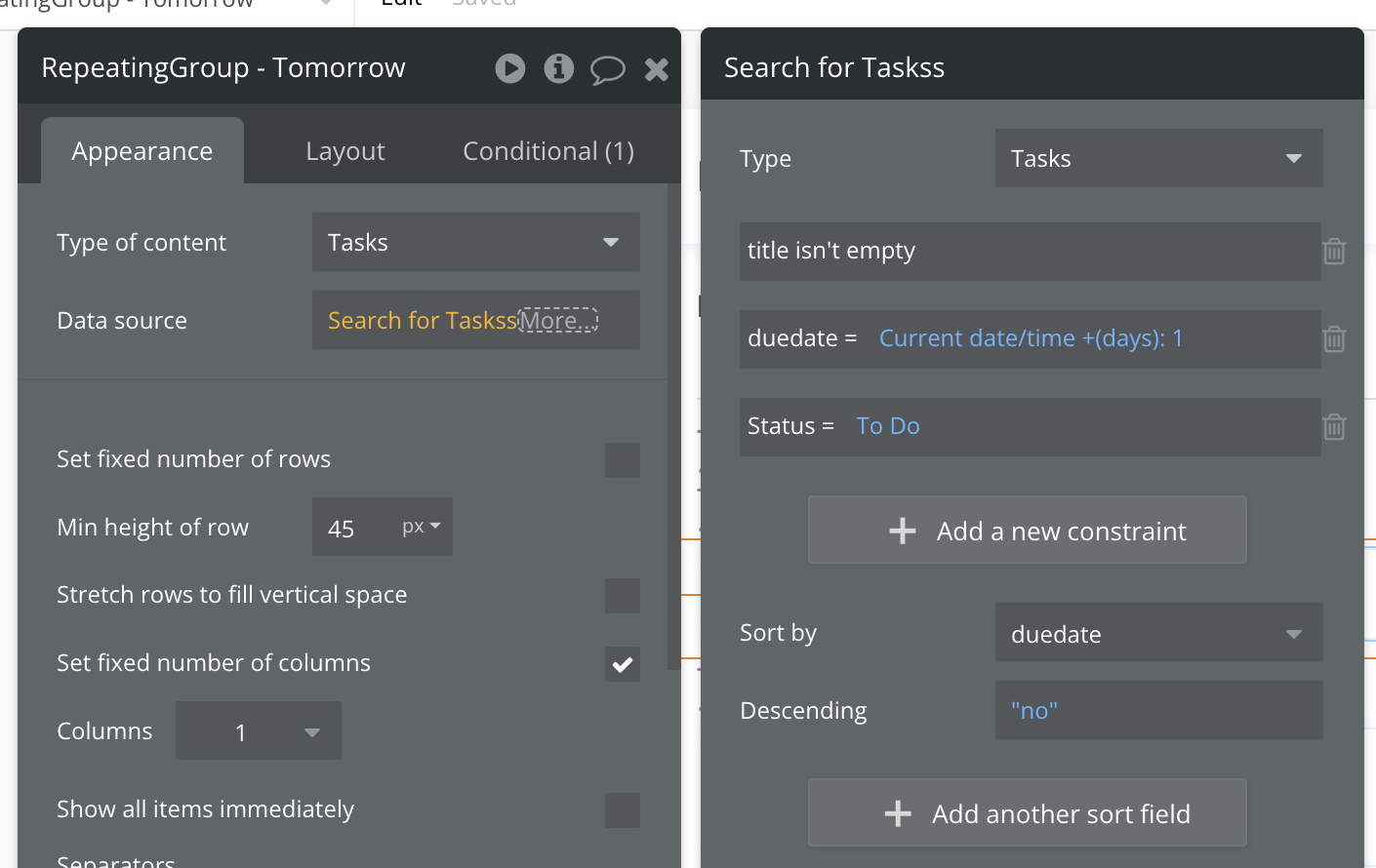 The current date/time plus 1 day is an exact moment tomorrow, and it is very unlikely that a task is due at that exact moment (which is why nothing is appearing in the repeating group). You need to use two constraints like I showed you, and round down to date instead of week.