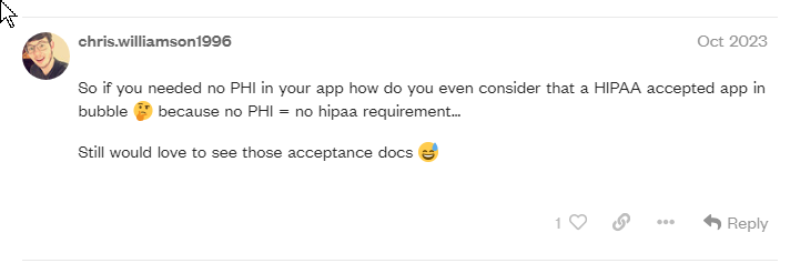 IF you want to label it as having no HIPAA requirement instead of HIPAA compliant, that’s surely your prerogative (and is in line with a super literal reading but is not the commonly used terminology), but it obscures the actual point that a Bubble app can be made without   HIPAA requirement (read: is HIPAA compliant) and that this template that doesn’t tokenize PHI  has a HIPAA requirement, which of course is unattainable (read: is not HIPAA compliant).