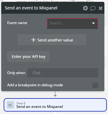 I created a Mixpanel account, entered my Token and API Secret (Mixpanel doesn’t show an API Key, and a forum search revealed I only need these 2), and tried to send an event from Bubble > Mixpanel but am met with this: