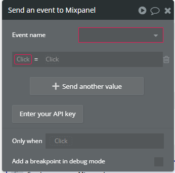 Also, the “Event name” field is free form. Nothing will show up in the dropdown until you set an event. Then when you go to do another “Send Event to Mixpanel” action, all the event names you’ve used before will show up. Same thing applies to the additional properties. It’s free form, so just start typing.
