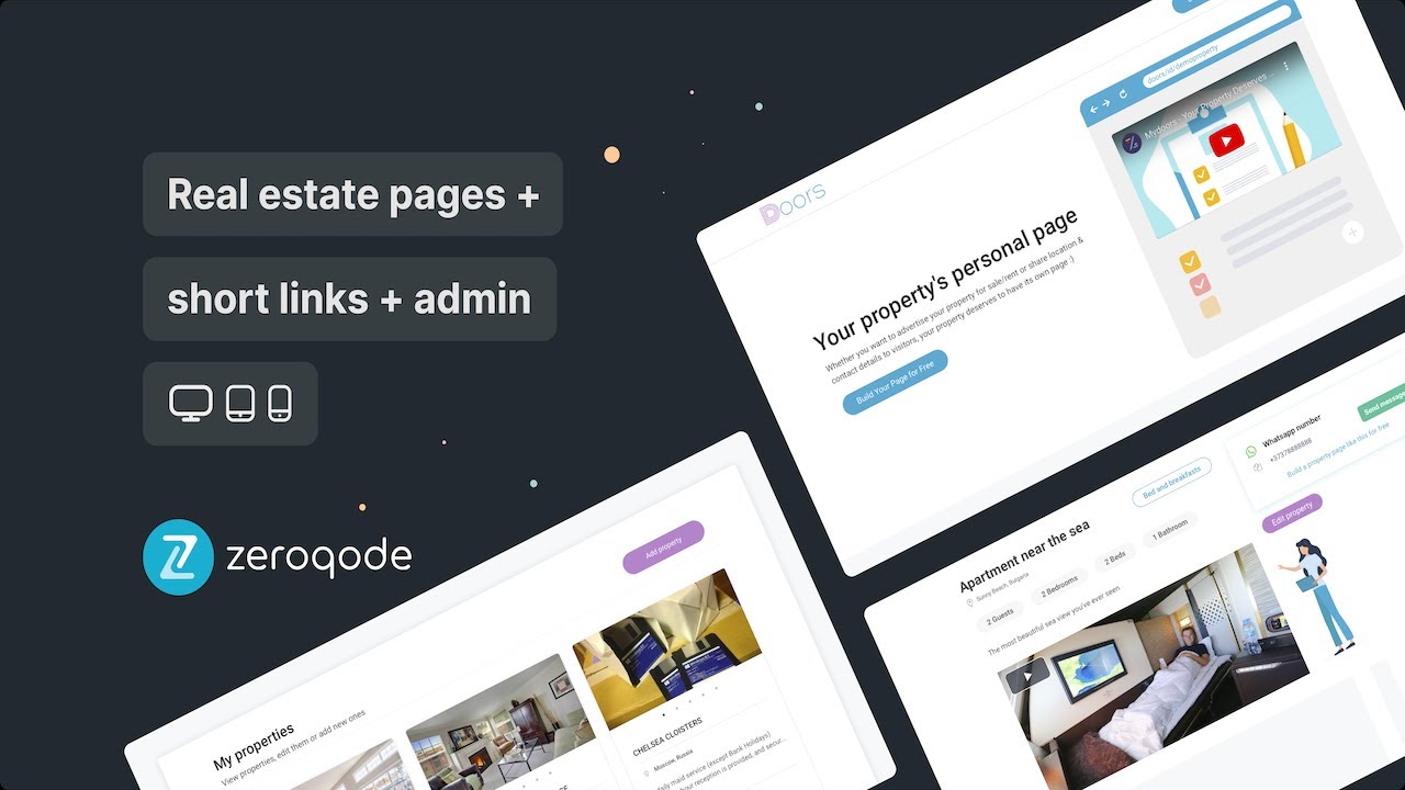 Doors is a template based on a property page builder website https://mydoors.to - it allows anyone to create a personal page for their property, upload video and images as well as detailed description, location and whatsapp contact number so that users can easily contact the page owner. The template allows generating short memorable URLs for each property so that the property owners could share them in online ads, social networks etc.