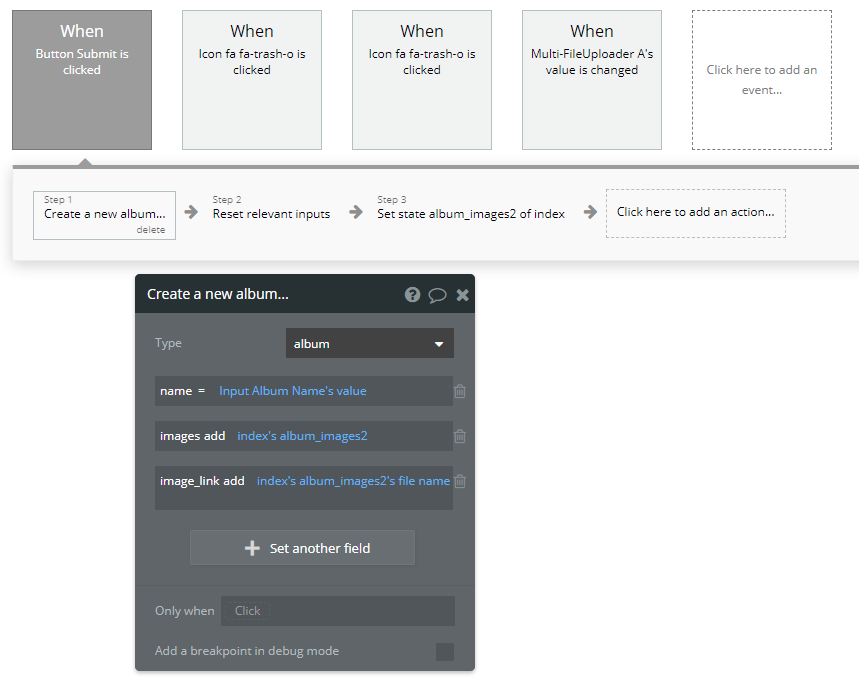 Thanks for your post! To add the files from the multi-uploader as a separate items, you might try the “add list” operator rather than “add,” which will add all entries of a second list (the album images) to an existing list (the images field). Let us know if that helps or if you have any more questions!
