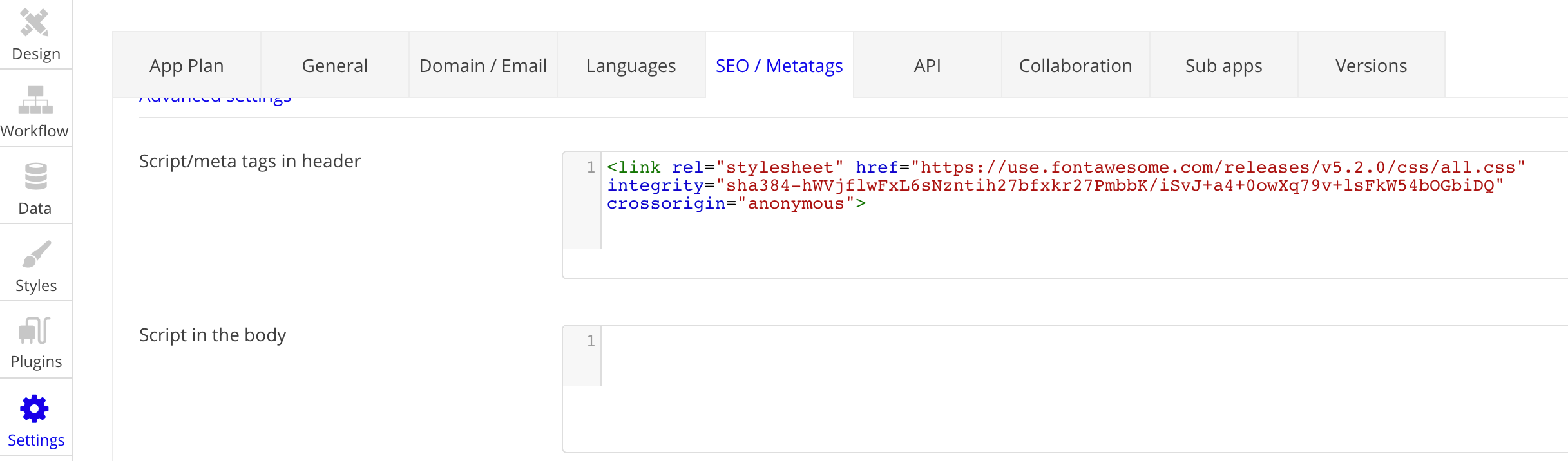 I did manage to get it to work for my use case by adding the FA style sheet link to the header of my app in Settings->Seo/Metatags and it seems to work fine so far.