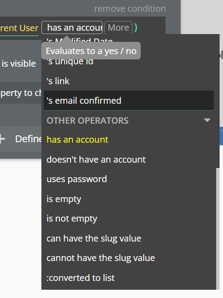 And then clicking on the ‘is logged in’ part of the expression again, at which point it changes to Current User Has An Account (and is logged in no longer shows up in the dropdown).
