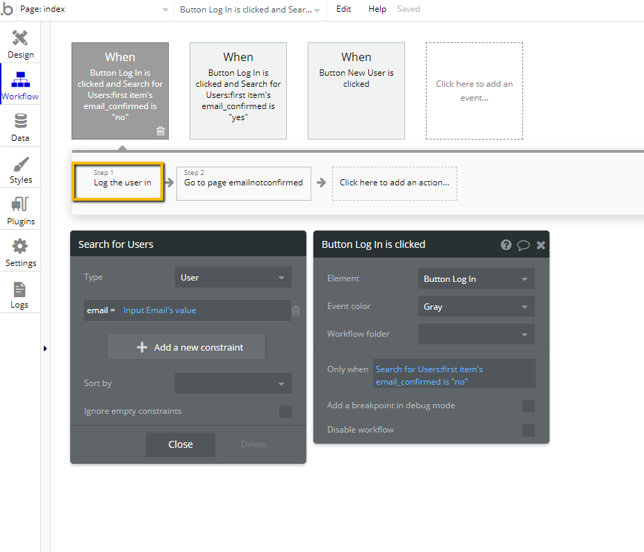 Hi @WilliaC I havenât tested this myself, but I think you would need to create two workflows for the login button. One for a confirmed email, and one for an unconfirmed email.
