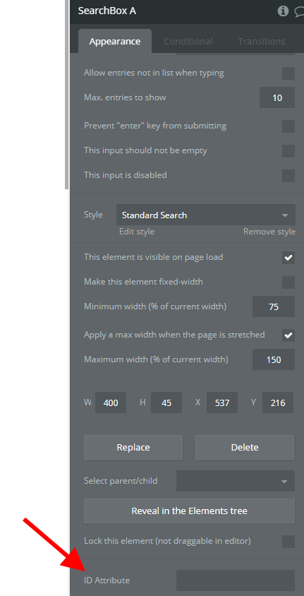 Complementing @boston85719 guidance, by checking the expose option in the settings tab will enable an element’s ID atribute to be set in the inferiormost part of its properties editor. An example with a searchbox element:
