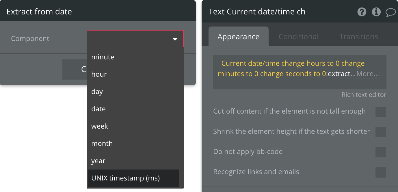 If a date/time property you can simply take your date property in Bubble and extract the UNIX timestamp like this. I’m obviously using a text field but the same functionality exists in your workflows