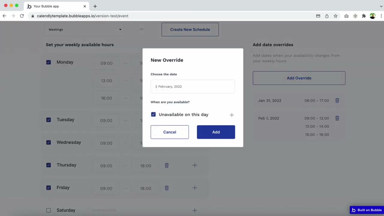 Live demo: https://calendlytemplate.bubbleapps.io/