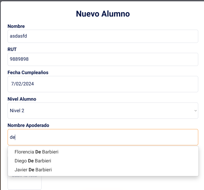 I have a search box in a student (alumno) creation pop-up. When I start typing the name of a guardian (apoderado), all the guardians that have been entered appear in a list (pic 2). When I select one of them, I need it to be saved in the database. I also need it to be displayed in the table and in the report
