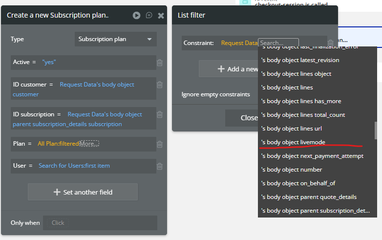 I’ve been following along the bubble x stripe tutorial on youtube here: Bubble x Stripe Part 2: Subscribing users (SaaS Payments Course) I’m on part two, and trying to setup the backend workflow at about 49 minites. I’m setting up the plan field and when I try to put in the constraint for metedata, this isn’t showing in the list at all: