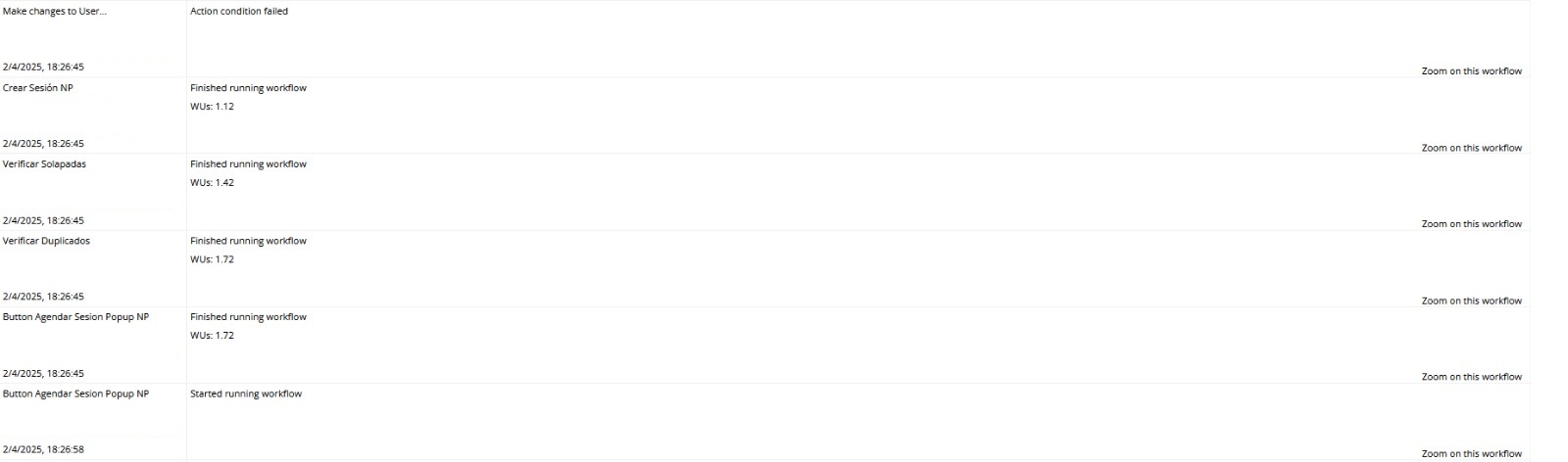 Verificar duplicados. Terminate if returned value is true.Verificar solapadas. Terminate if returned value is true.Crear Sesion NP.I rather repeat the workflow on button depending on the condition than create a workflow that runs e certain conditions.