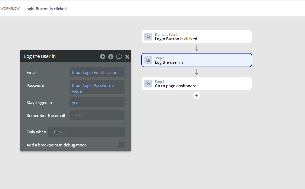 Created a login modal with email and password inputs, and a login button with the workflow action “Log the user in” using these inputs.