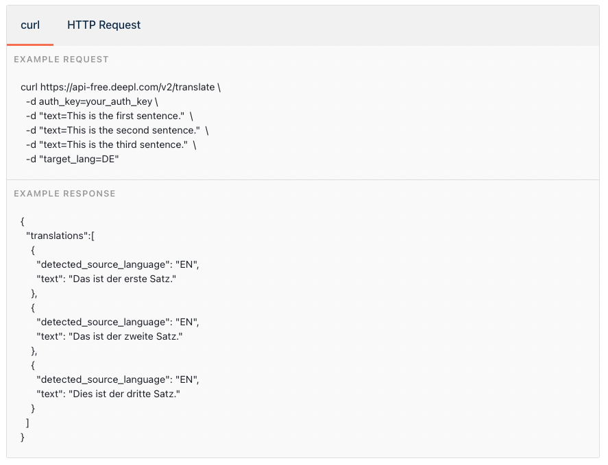 I now need to translate the sentences in bulk. Logically, I want to make as little API calls as possible. For a translation engine I chose DeepL. For translating multiple sentences at a time, their docs show the following: