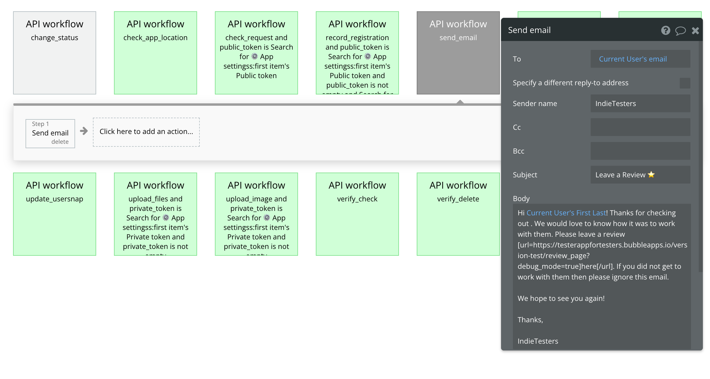 Currently, my app has a review system where after a client picks a person to work with they get an email a few days later asking to review them after they work with their person. I have set up a workflow in Bubble with an API that delivers the email after they hit a button within my app.
