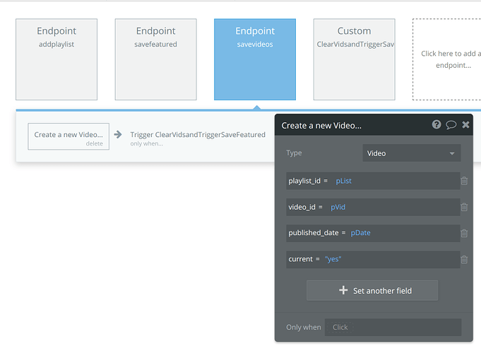 ok, so i can get the database to create entries but as far as saving data from the api call, I don’t seem to be able to create the field variables like you did on your first post. Where you schedule api workflow save videos and you have plist, pvid, etc.