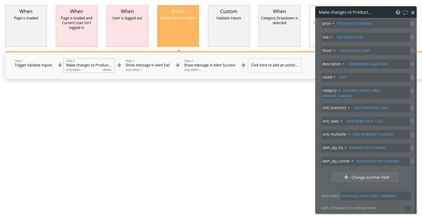 In my app I hooked up a save button to a workflow that makes a change to an existing thing. The problem is I need to click the button multiple times for the changes to actually be persisted into the database. You can find my app here, and the bug happens for multiple types of things: products, profiles, and customers. It happens if it’s a new product or if it’s an existing one, and it happens across multiple pages.
