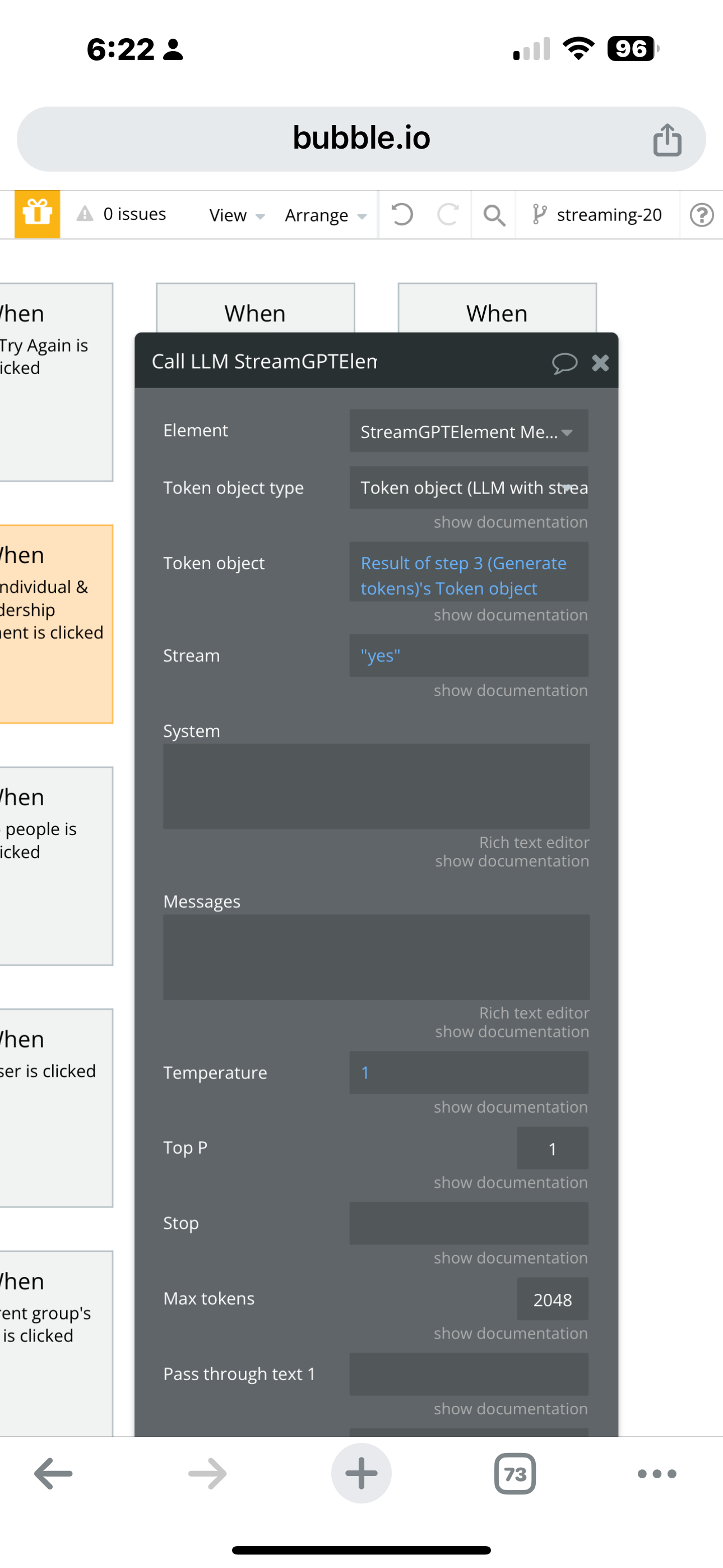 Can you please send a screenshot of your generate tokens property window and the call llm property window?
