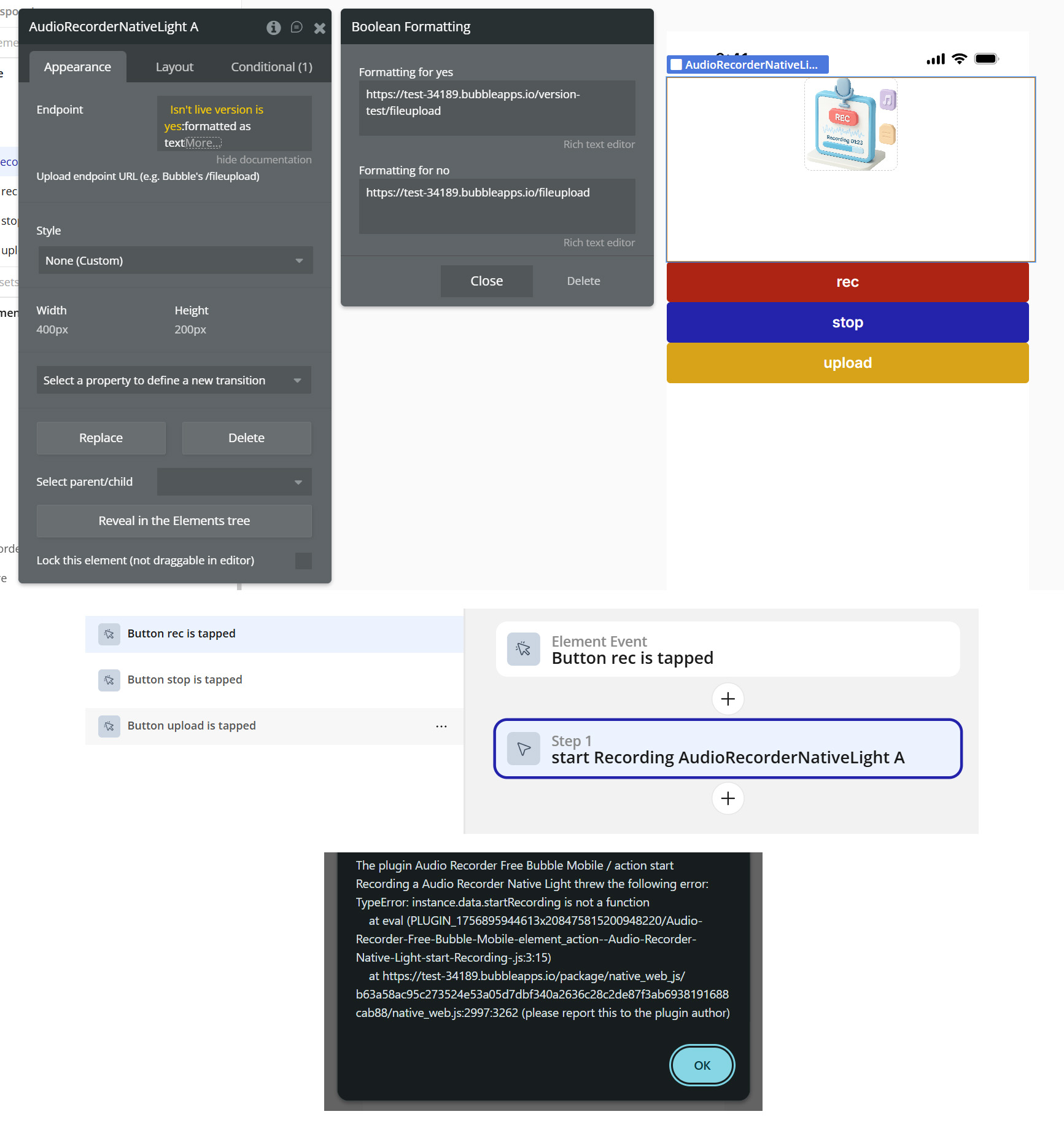 Thanks for reporting this. The errors in your screenshots - āCannot read properties of undefined (reading āprepareā)ā and āinstance.data.startRecording is not a functionā - usually happen when the recorder element hasnāt been initialized by the environment. This plugin is a native-mobile one, so it needs to run on a real device (Bubbleās native wrapper/Bubble Go or any webview wrapper) with mic permissions granted. Running it in a desktop browser or triggering the action before the element is ready can cause exactly those messages.