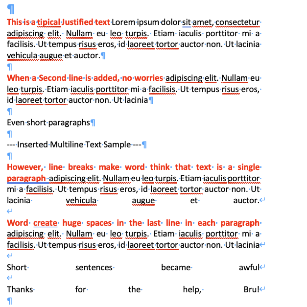 There is no error per se… In a word document we have both new paragraphs and line breaks. Multiline inputs sends linke breaks that make the justified text horrible.
