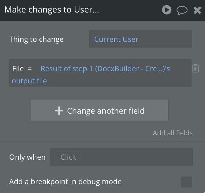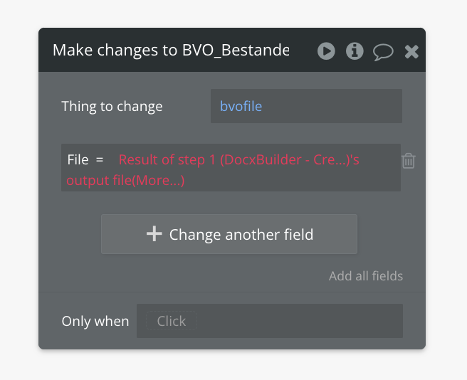 The issue you’re encountering is likely due to a mismatch in data types. Specifically, the field in your app data that you’re trying to associate with the Docx file might not be set up as a “File” or “Text” type.