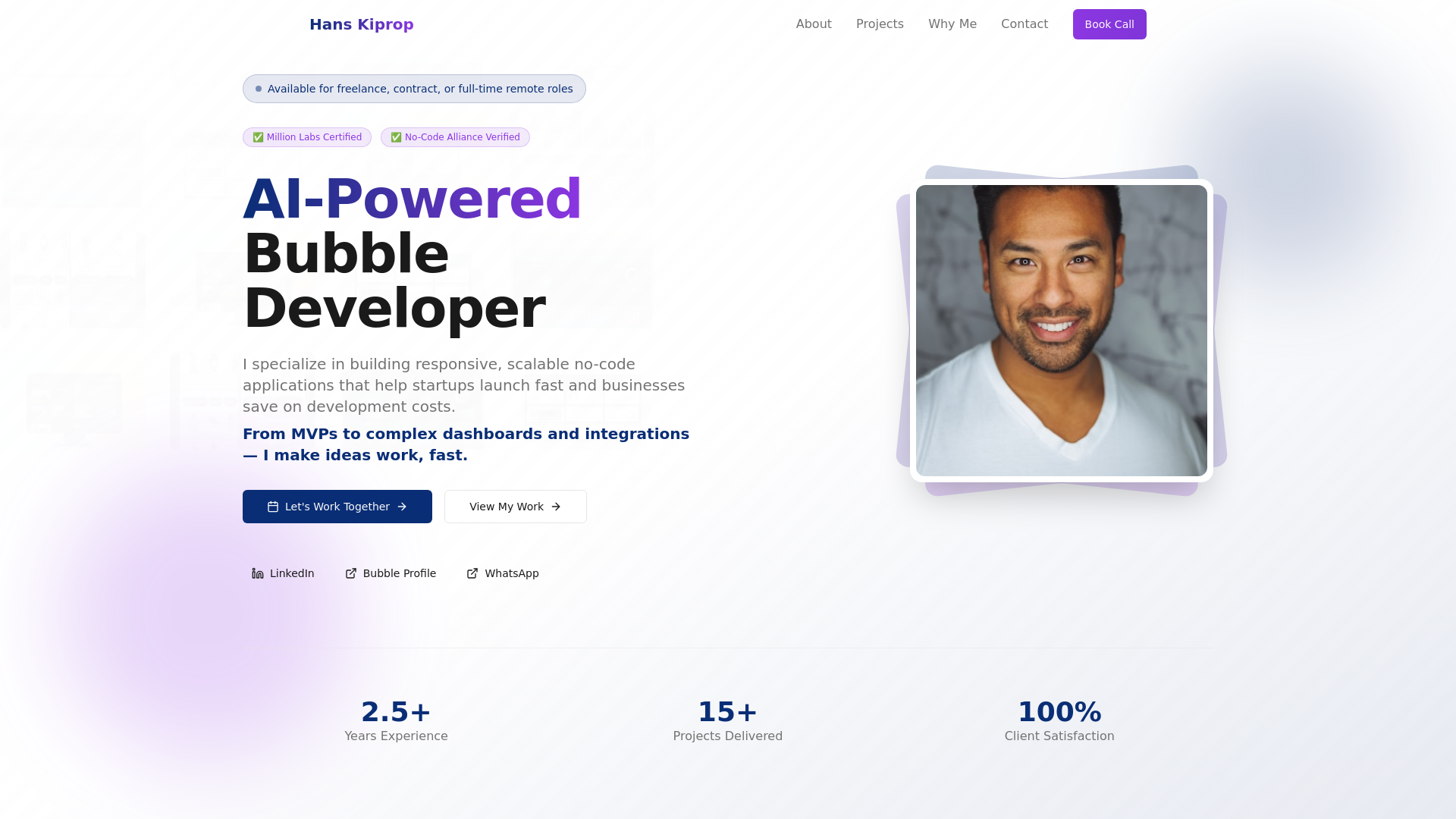 I’m Hans, a passionate and results-driven Bubble developer with a strong focus on building real, scalable solutionsnot just prototypes.Over the last few years, I’ve helped startups, agencies, and founders bring their ideas to life with clean UI/UX, efficient workflows, and smart database design. From AI-powered assistants, real estate platforms, and internal tools, to testimonials management systems I build apps that are fast, functional, and future-ready.