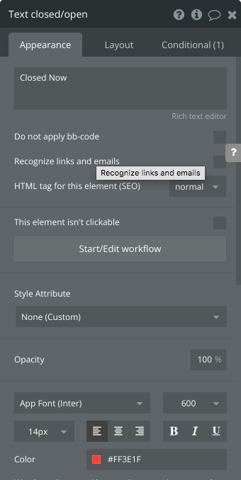 In order to make it so a text will display open or close based on current time and the stores operating hours, you will need to have the database structured to have field values of hour as a number and minutes as a number and the day of the week as a number. You will need it for both open and close as some stores will open on Monday but close in the early AM on Tuesday.
