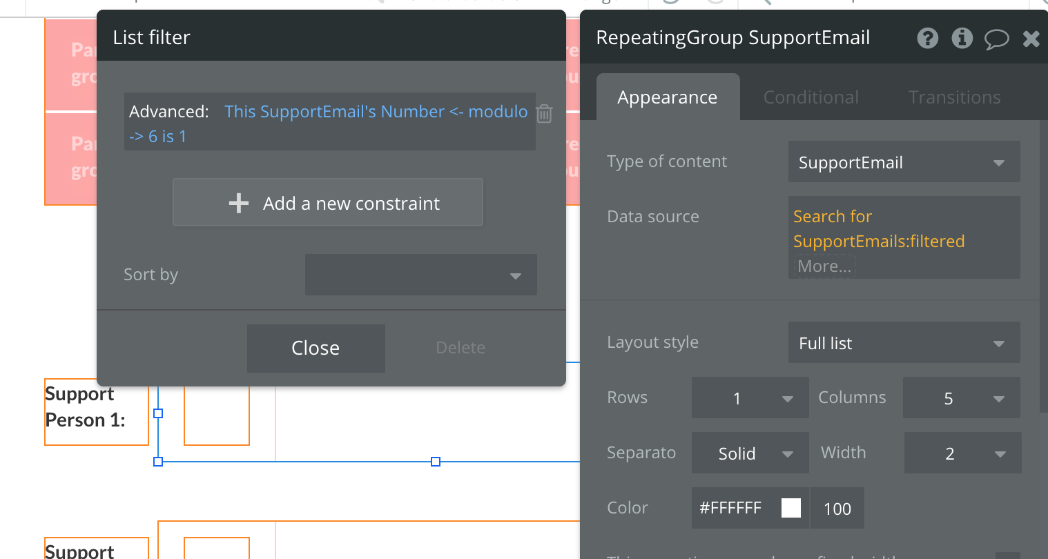 Hi @nikolai  I’ve tried to setup something similar before, and I think the ‘modulo’  operator might be helpful too! For example, in this repeating group I have 30 Support Email Things, and each of them have a number (1 through 30):