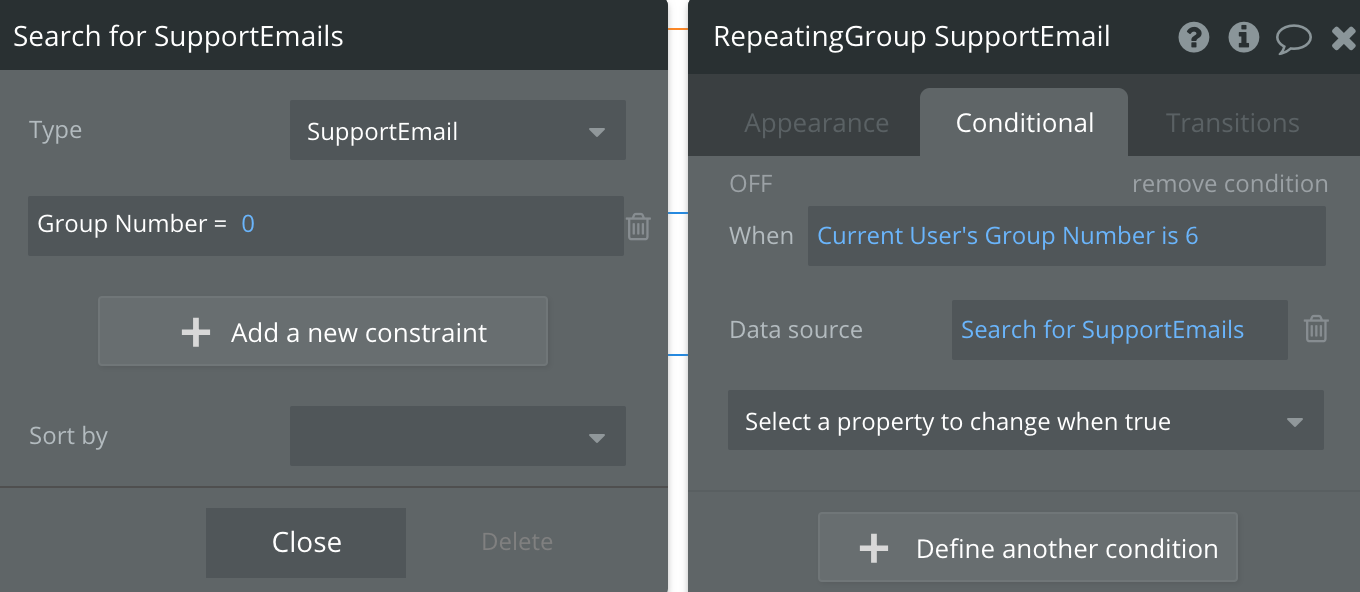 Then, the Users in your app can have a corresponding Group Number field (1,2,3,4,5 or 6).  You can query the corresponding Support Emails (which match the User’s group number) using “Do a Search for Support Emails” (constraint: Group Number = Current User’s Group Number").