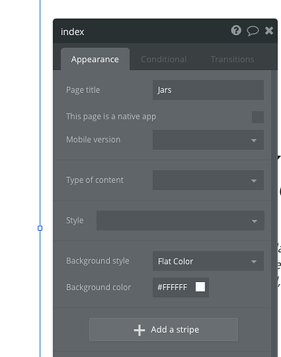 Pull up the editor for your page - just click anywhere on the page that’s not an element and you’ll see your settings for the page. The field “Type of Content” is where you to set its data type. Pages don’t require them, but if you’re building a template page like this for blog posts, you’ll want to set it to your blog post data type so that you can display dynamic data (your blog posts) on it.