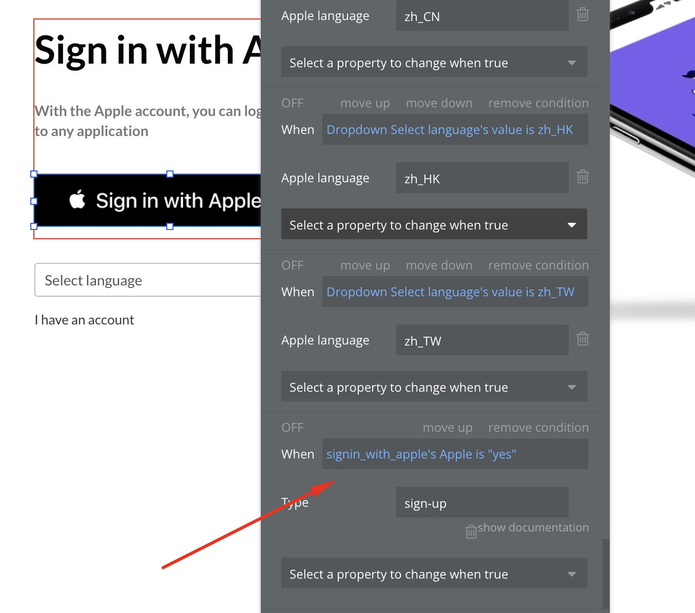 Due to Apple’s technology, you can add only one Sign in with Apple button. Otherwise, it may cause conflicts. Please check out our demo editor page to see the example setup: Zeroqode-demo-20 | Bubble Editor