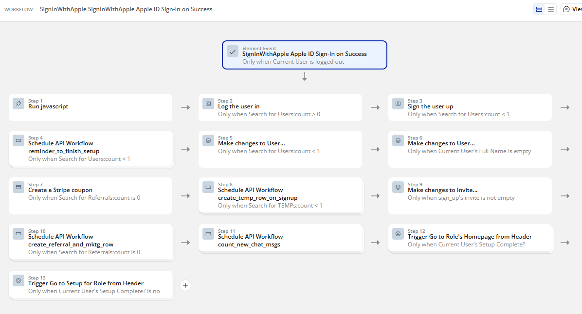 Try enabling Bubbleâs debug_mode to see whether the authentication is completing and whether the event is being skipped due to a condition or timing issue.