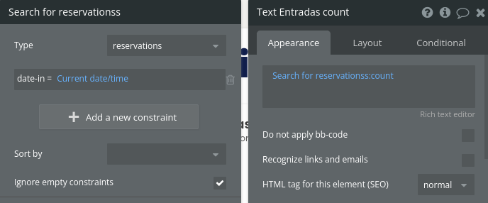 Hi there, @Viktor… because Current date/time is the current date and the exact current time (which means none of the reservations are going to meet that exact criteria), change the equals sign to greater than, and then add the :rounded down to operator after Current date/time and select date for the component. You will probably also need to add a second constraint where the date is less than the current date/time plus one day rounded down to date.